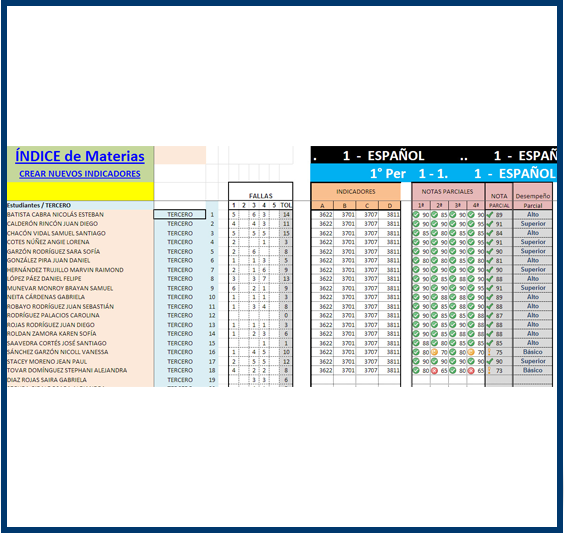 • Esta Planilla se construye para cada Docente según su carga académica. Esta desarrollada en un ambiente gráfico interactivo, con menús intuitivos, con botones y códigos en colores (Evaluación Intuitiva), Con reglas de Validación (Restringe valores No permitidos); Desarrolla los promedios automáticamente por periodo y Año y muestra la evaluación mínima requerida para superar la asignatura.