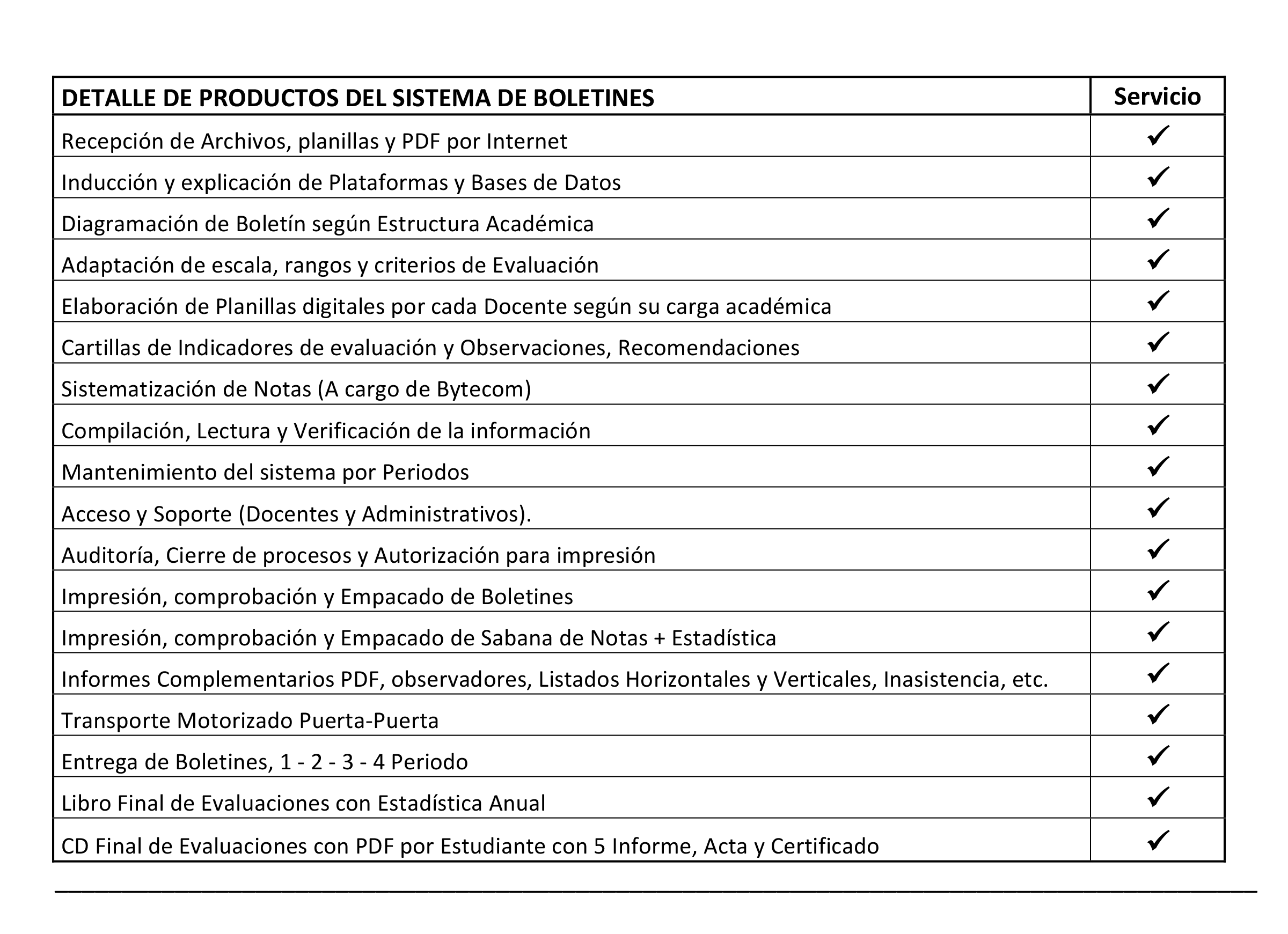 En Bytecom todos nuestros clientes son igual de representativos, independiente de la cantidad de estudiantes; puesto que sin importar el tamaño que se asocia a mayores utilidades, queremos Entregar el bienestar Total a nuestros abonados. Por eso ofrecemos un único paquete que contiene la totalidad de nuestros servicios, disponibles en todo momento a todos nuestros clientes. Cuando un Colegio nos contrata tiene acceso a todos estos productos: